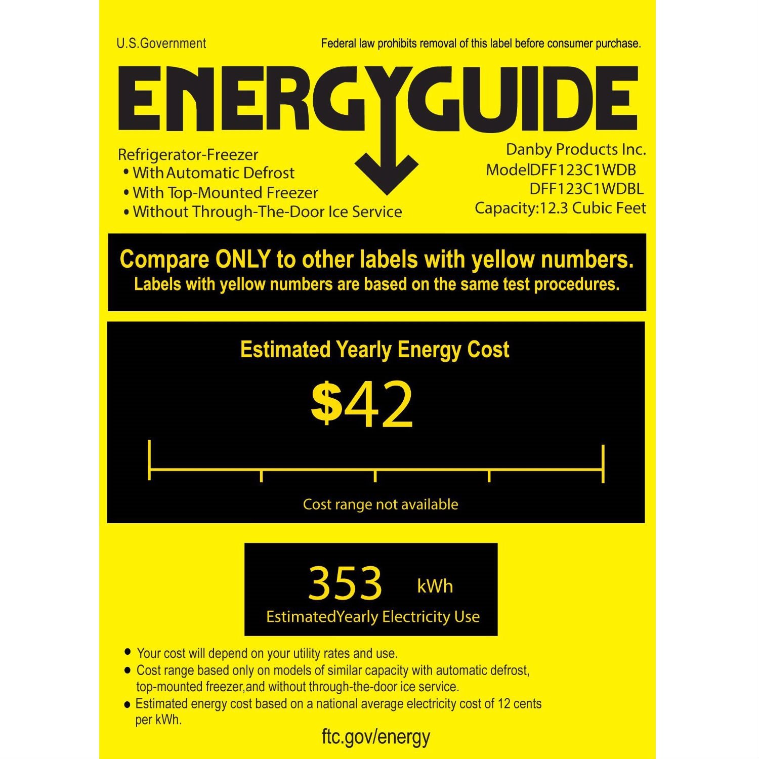 This 12.3 Cubic Foot Frost-Free Refrigerator with Top-Mount Freezer in White would be a great addition to your home. Features: -Apartment size. -Color: White. -Environmentally friendly R600a refrigerant. -Frost free operation provides hassle free maintenance and, improved food preservation. Product Type: -Top freezer refrigerator. Finish: -White. Number of Items Included: -1. Drawers Included: -Yes. Refrigerator Capacity: -12.3 Cubic Feet. Generic Dimensions: -2 Full width and 1.5" width wire shelves for maximum, storage versatility. Specifications: Energy Star Compliant: -Yes. Dimensions: Overall Product Weight: -143.3 Pounds. Overall Height - Top to Bottom: -59.81 Inches. Overall Width - Side to Side: -23.81 Inches. Overall Depth - Front to Back: -30.38 Inches.