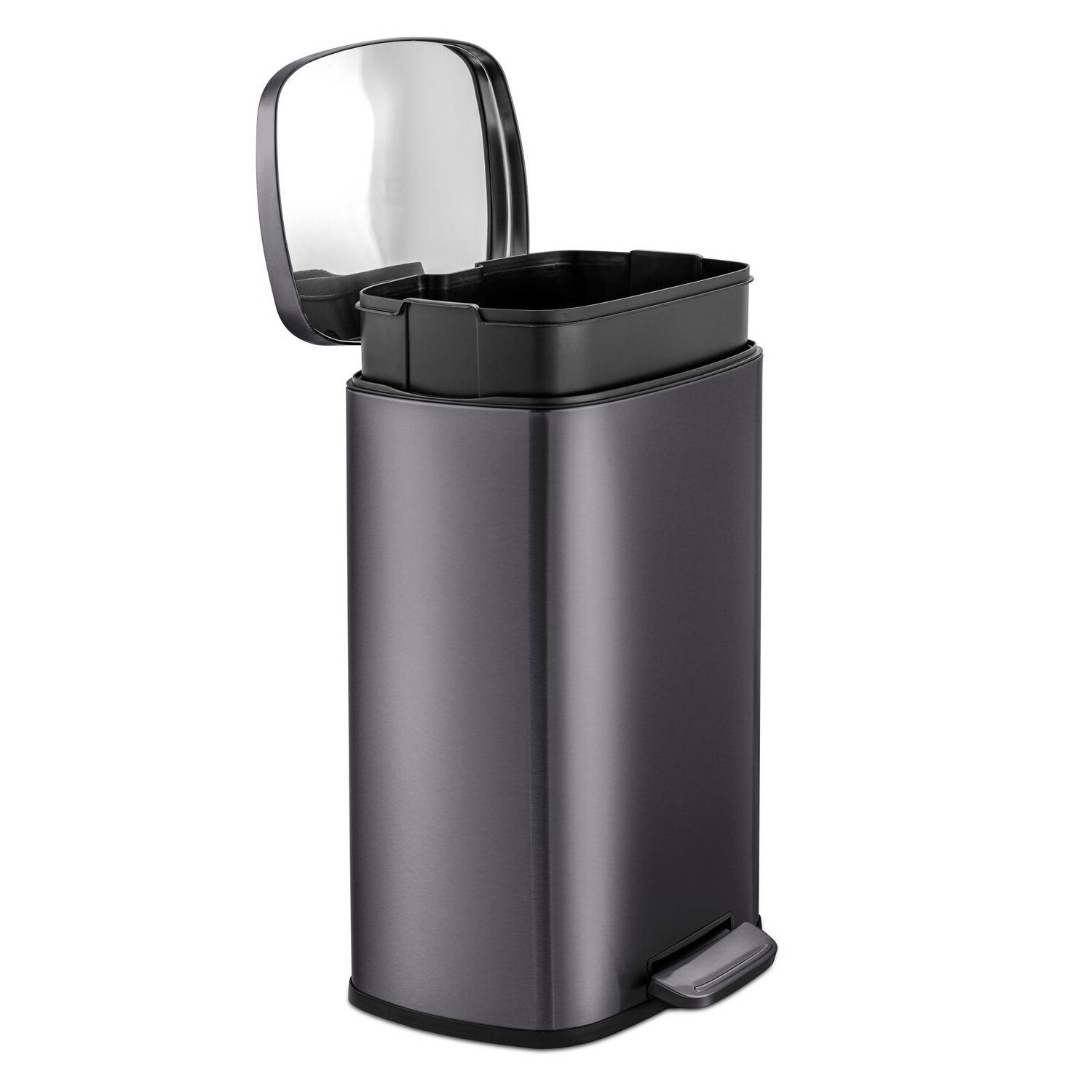 Minimal design 50 Liter / 13.2 Gallon black stainless steel kitchen trash can. Rectangular shape garbage can with step pedal open lid. Constructed from commercial-grade T430 stainless steel and built to withstand consistent use. Fingerprint-resistant body, soft-close lid, removable leak-proof inner bucket, and non-skid base ñ to provide you with an exceptional trash experience at your home kitchen, or office.