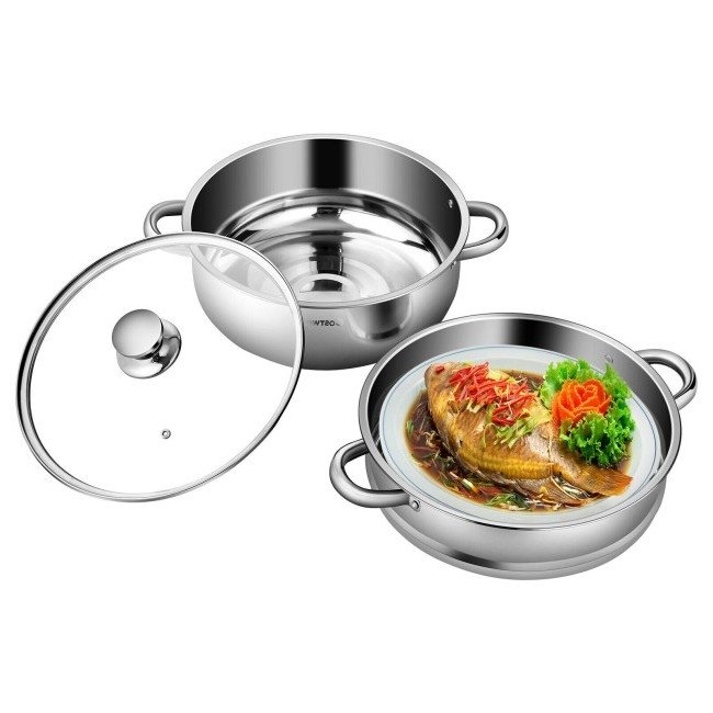 The steamer cookware set strikes a perfect balance between high steam efficiency and 360∞ cyclic orientation. It comes with a 5.3 qt sauce pot and a 4.2 qt steamer insert that makes the simultaneous cooking and steaming come true. The tempered glass lid included features good seal to retain the flavor of food. Transparent glass also enables a clear observation of cooking food. It is equipped with a steam outlet, designed to discharge the heat and thus relieve the pressure. Riveted handles on the lids and both sides of the pot body are user friendly, for convenient control.