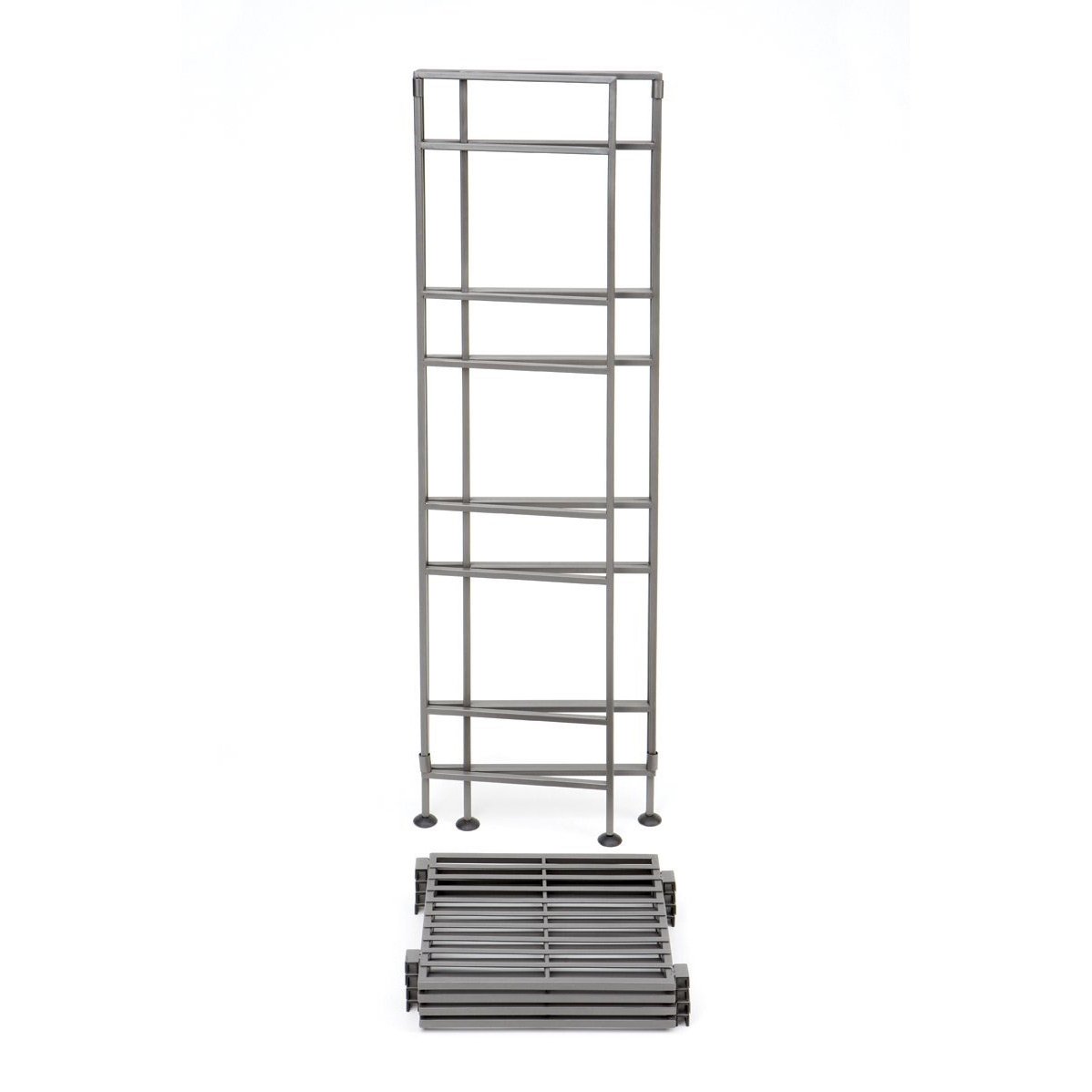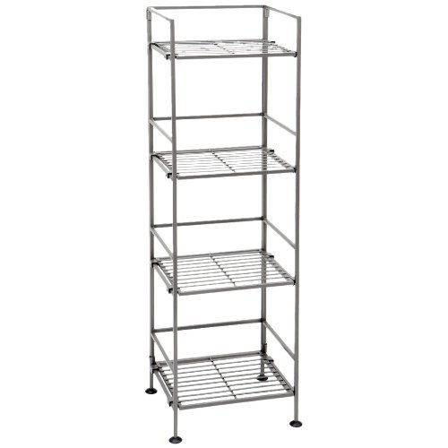 This 4-Shelf Iron Tower Storage Shelves - Great for Kitchen Office Garage is great for storing any items that you desire. Its contemporary style will add flair to your living room, bedroom, bathroom, kitchen or office! The wrought iron shelf folds flat for easy storage or transportation. With the new Snap-on feature, you can now connect multiple units horizontally for a complete custom fit.This unit measures 13-Inch by 11.24-Inch and 44-1/4-Inch high.