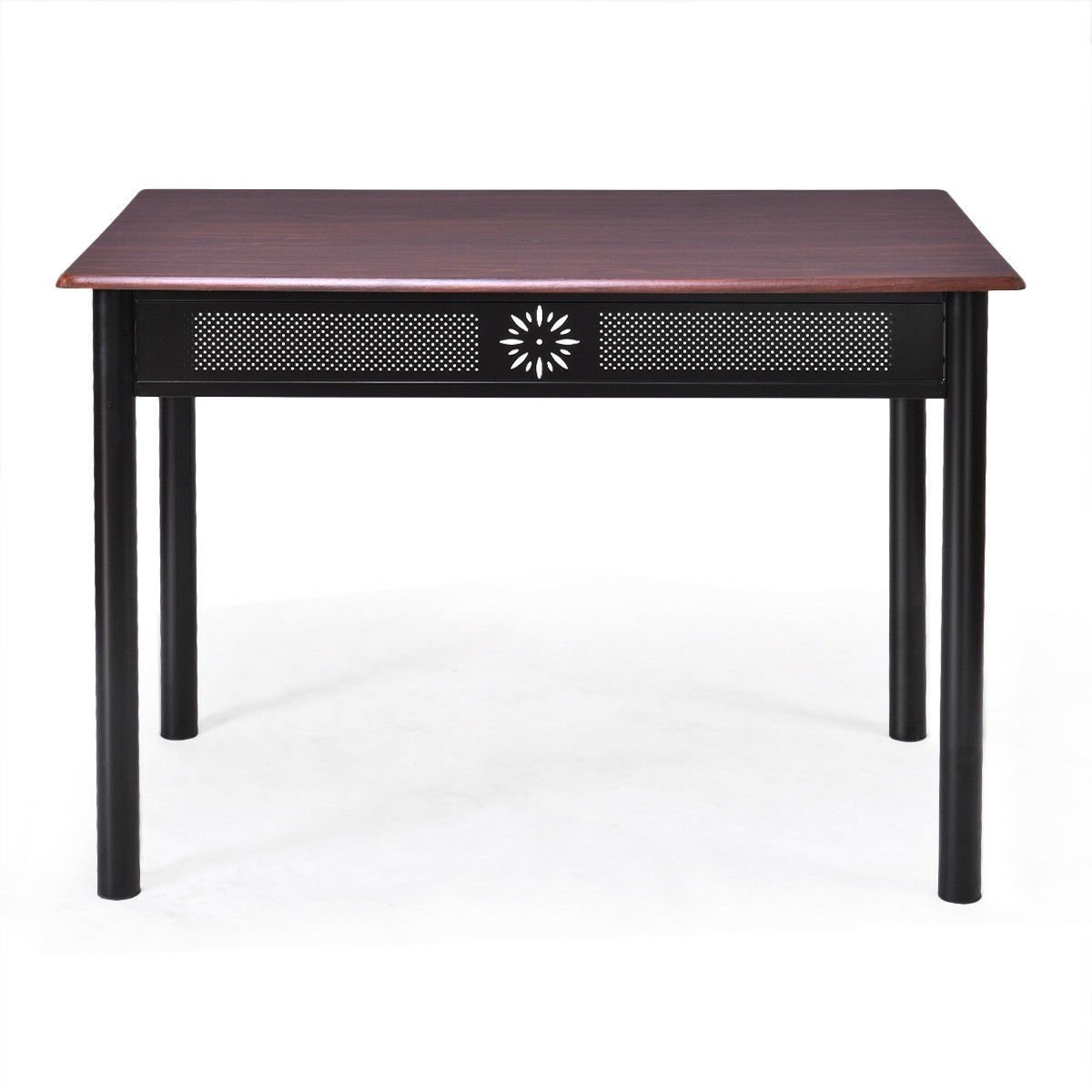 This premium 5-Piece Black Brown Dining Set Wood Metal Table and 4 Chairs with Cushions is a must have for your home. Crafted with curved angle edges to prevent injury from hitting the sides. Made with strong black steel frame with stock legs this dining set is built to last. The 4 chairs have a thick padded seat providing comfort and stability while you enjoy your dining experience.