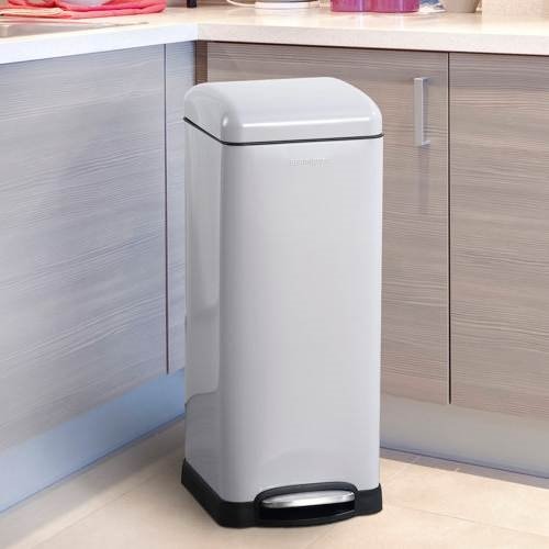 This 8 gL Retro Grey Steel Step On Garbage Trash Can hides plenty of capacity within its slim size, making it a great choice for home offices, craft rooms, laundry rooms, and other small spaces. Featuring a profile hinge and retro silhouette its sleek design allows it to sit close to a wall or cabinet. Its design features don't end there it is finished in powder-coated stainless steel, features a steel step-on mechanism that allows for smooth openings and closings, and has a removable plastic liner that makes the bag changes a cinch.