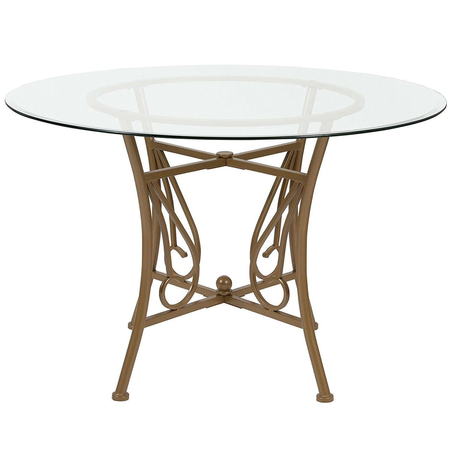 This Contemporary 45-inch Round Glass Top Dining Table with Matte Gold Metal Frame will add an elegant aspect to your eat-in kitchen or dining room. The glass is detailed with beveled edges. The main attraction on this table is the stylish, ornamental base. Floors are protected with floor glides in case of accidental movement or rearrangement. Gather family and friends to enjoy great meals around this beautiful table.