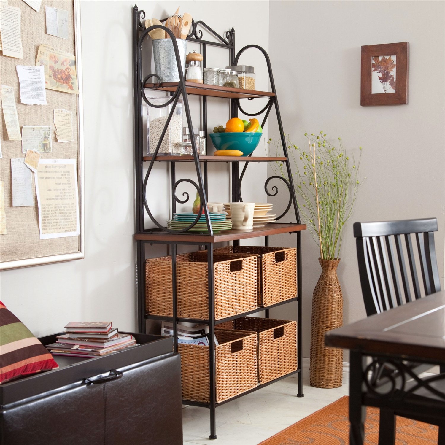 Country charm with a healthy dose of urban chic makes this Durable Metal and Wood Bakers Rack with Classic Wicker Basket Storage a good choice for nearly any kitchen or dining space. Supported by a sturdy metal frame with bold scroll accents, this rack has a classic black finish that will never go out of style. Three shelves, ascending in size, are easy to maintain and ideal for storing dishes, cookbooks, cooking utensils and more. For the items you'd rather not have in sight, the four wicker baskets will come in handy for quick clean ups.