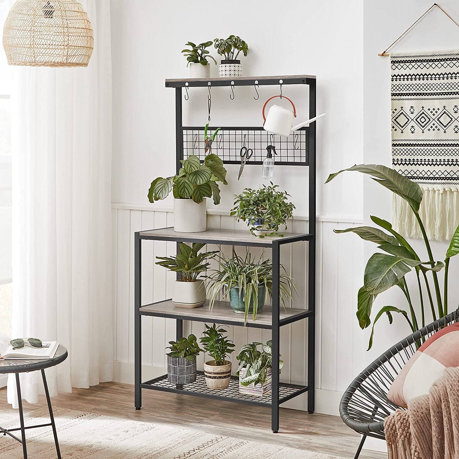 Create your insta-worthy dream kitchen with this Modern 3-Shelf Black Metal Light Grey Wood Kitchen Baker's Rack Microwave Stand. Combining an steel frame and wooden shelves, it adds uniqueness without losing the pleasant atmosphere for you to enjoy freshly baked pizza. Oven, Microwave, Coffee Machine: If all of these are essential items for you, donít worry! Strong steel frame and quality 15 mm thick particleboard have the strength, so you can put nearly all you need on this kitchen shelf: Place pots on the 3 shelves, customize the mesh panel by hanging cups and potholders, leave ladles and spatulas on the top hooks, and use the top narrow shelf for spice jarsónow it's up to you! You donít need to an expert on the assembly of this kitchen shelf, as it comes with numbered parts and step-by-step instructions to make it easy-peasy.