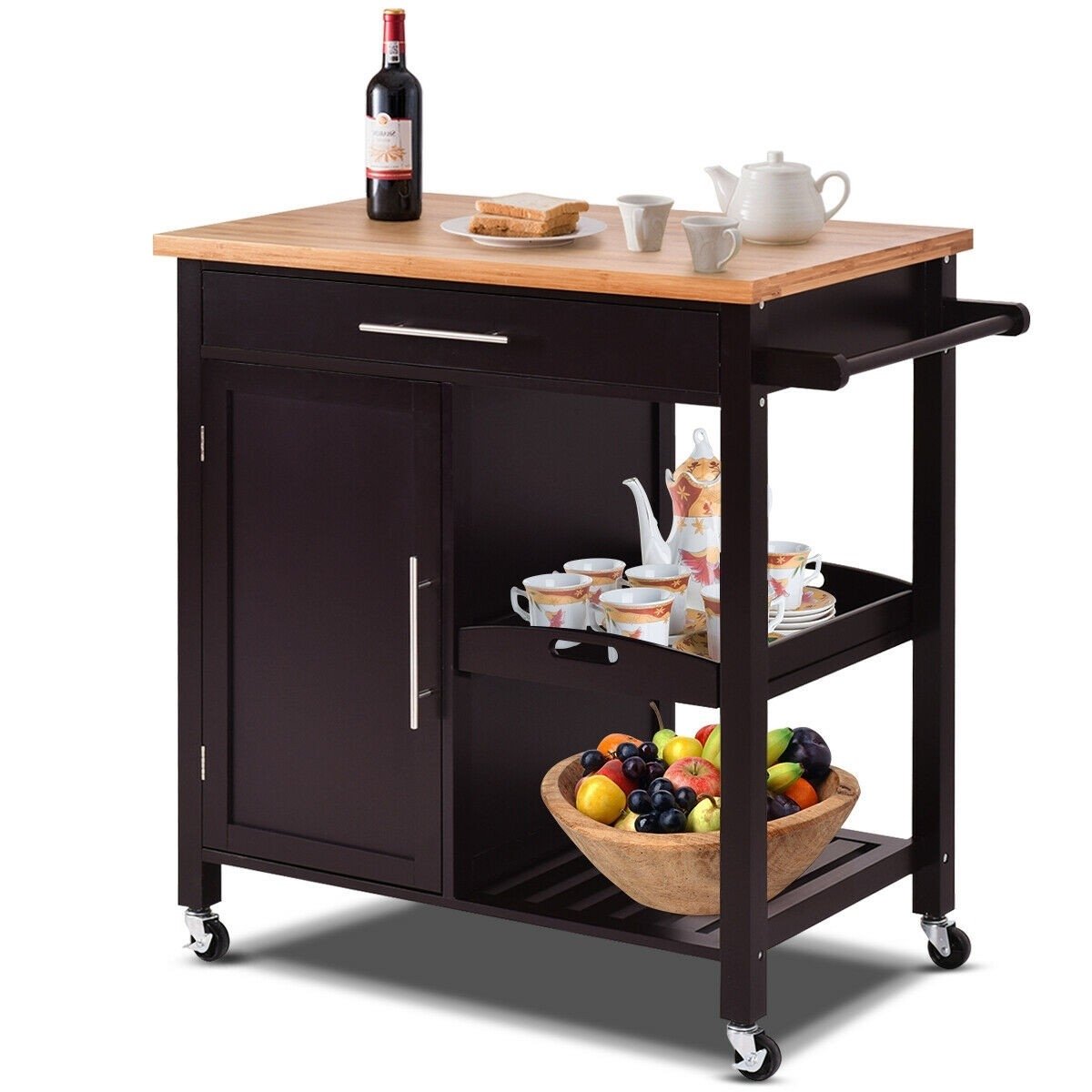 This Modern Black Bamboo Kitchen Island Cart with Wood Top is ideal for adding extra counter space to your kitchen. Made of high-quality bamboo and engineering MDF, this kitchen trolley cart is sturdy and durable, lasting for lifelong use. The trolley cart features a hierarchical design offering large storage space and enhancing the utilization of kitchen space. It has two-layer shelves and a large storage compartment offering spacious space for kitchen wares. Plus, an ergonomic handle makes it more comfortable for pushing or you can use it as a towel rack. With four universal steering casters, it provides easier mobility. If this happens to be what you are looking for, don't hesitate to add it to your cart!