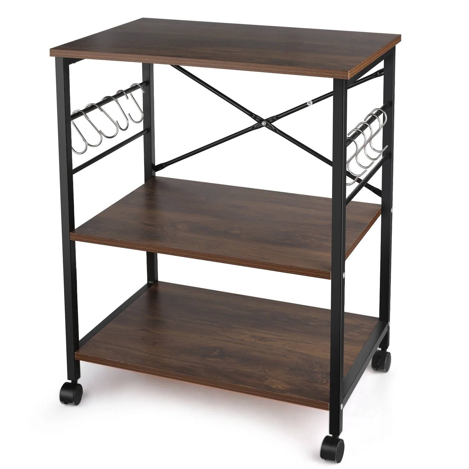This Modern Industrial Black Metal Brown Wood Kitchen Baker's Rack Microwave Cart is an industrial storage stand for kitchen living room decoration. Put a microwave oven or other kitchen appliances on the sturdy top shelf and store toaster, spice, dishes, and any other utensils on the 2nd or 3rd tiers. Configured 10 steel hooks make it convenient and easy to hang some cooking tools. An odor-free and anti-mildew ensures durability in storage and decoration. Equipped with 4 flexible wheels, 2 of which are lockable, allow the cart table to go where you go to take advantage of your cabinet space. You can effortlessly wheel it to the living room, office, or bedroom as a kitchen appliance cart, coffee stand, small rolling bookshelf or small bakers rack. The locks will keep it in a fixed position when needed.