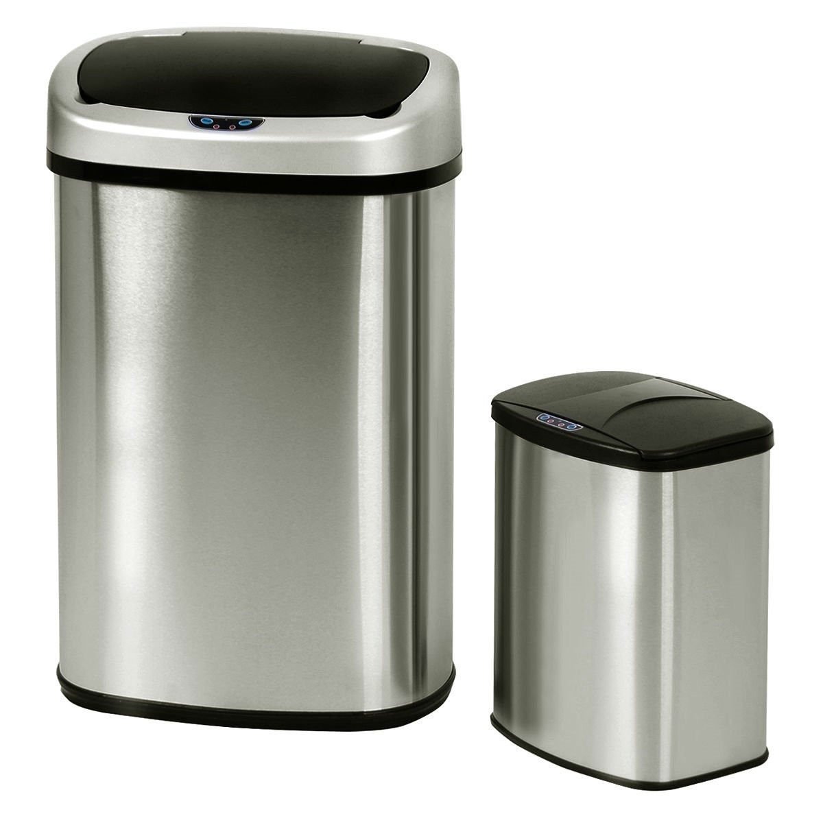 This Modern No-Touch Motion Activated Kitchen Trash Can - Set of 2 will meet your family's needs. You can use them almost in any place you want, such as kitchen, office, bathroom, dorm room or kid's room. This set comes with 2 trash cans -- one kitchen size (13 gallon) and one bathroom size (2.3 gallon). These trash cans are made of stainless steel, which are stable and easy to clean. They feature antimicrobialcommercial-grade stainless-steel sides with snug-fitting plastic tops. The water-resistant infrared motion sensor detects motion within inches of sensor range. These two trash cans use the most advance sensor technology. They open automatically when your hand or debris nears the infrared induction area. After your hand or debris moves away, their lids close in seconds. They also seal odor in and eliminate cross-contamination with touch-free operation. What's more, the energy-saving technology keeps battery life longer in normal daily usage. This set of 2 trash cans comes at good price. Do not hesitate to buy one!