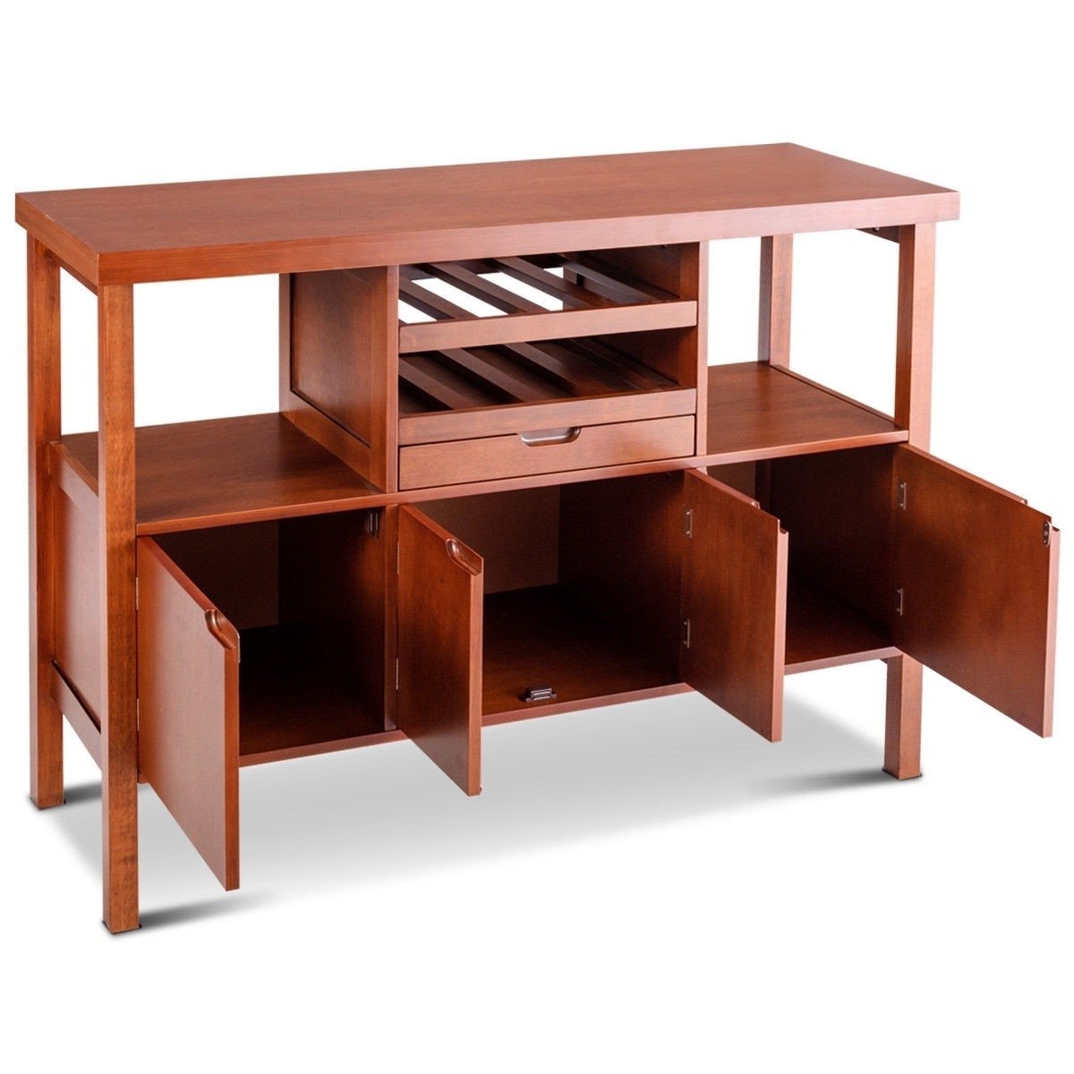 This Modern Sideboard Buffet Cabinet with Wine Rack in Brown Wood Finish combines with elegant and classic style. Construct of high quality non-toxic MDF and pine wood, it is sturdy and durable. It features two wine racks which can hold up 8 bottles and a small drawer to store your serving accessories. It comes with two side open shelves, two single door and one double door cabinet for all your kitchen gadgets and tools storage. This server table makes a tremendous value as well as a great space saver for your kitchen. This storage sideboard is ideal for your kitchen, dining room. Don't hesitate to buy one!