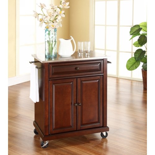 Constructed of solid hardwood and wood veneers, this Portable Stainless Steel Top Kitchen Cart Island in Vintage Mahogany is designed for longevity. The beautiful raised panel doors and drawer front provide the ultimate in style to dress up your kitchen. The deep drawer are great for anything from utensils to storage containers. Behind the two doors, you will find an adjustable shelf and an abundance of storage space for things that you prefer to be out of sight. Style, function, and quality make this kitchen island a wise addition to your home.