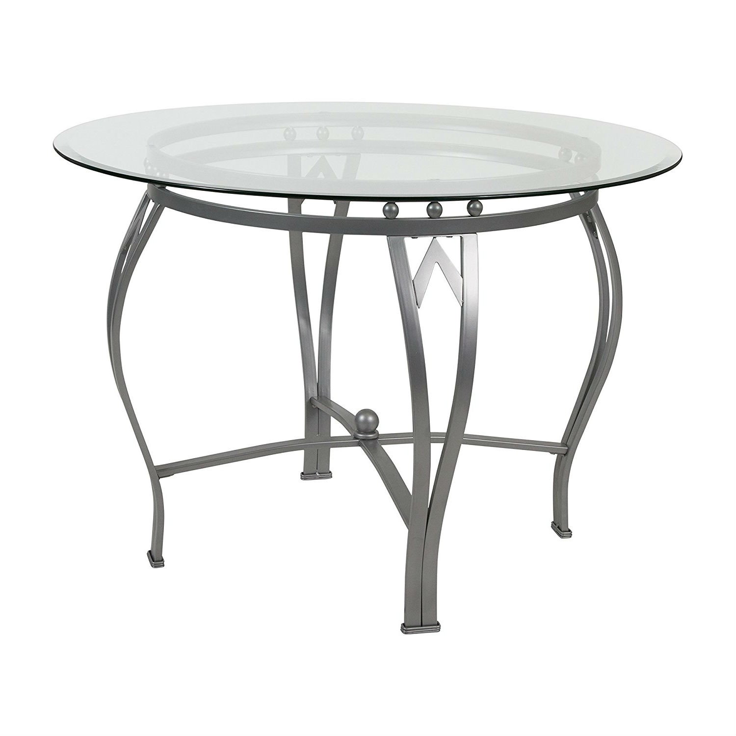 This Round 45-inch Clear Tempered Glass Dining Table with Silver Frame will add an elegant aspect to your eat-in kitchen or dining room. The glass is detailed with beveled edges. The main attraction on this table is the stylish, ornamental base. Floors are protected with floor glides in case of accidental movement or rearrangement. Gather family and friends to enjoy great meals around this beautiful table.