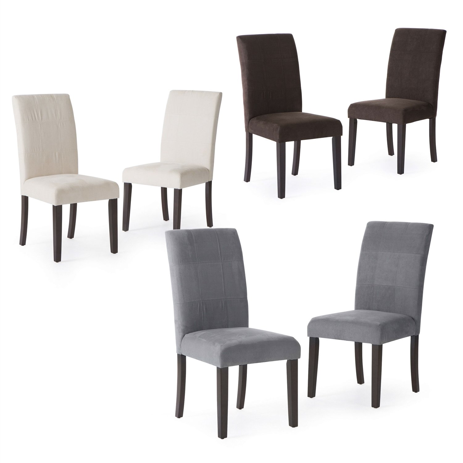 This Set of 2 Light Beige Padded Microfiber Dining Chairs is a decidedly updated take on the classic parsons chair. Distinctive and comfortable, these chairs feature gently flared backs, spacious seats, and an armless design. Sophisticated grey microfiber fabric upholstery and subtle box stitching add a contemporary spin. Straight legs feature a dark espresso finish for contrast. This set includes two Palazzo Dining Chairs with solid birch wood frames. Plush padding on the seats and backrests ensure dinner guests are seated in stylish comfort. These chairs are designed for residential use only and bring a distinguished look to your dining room.
