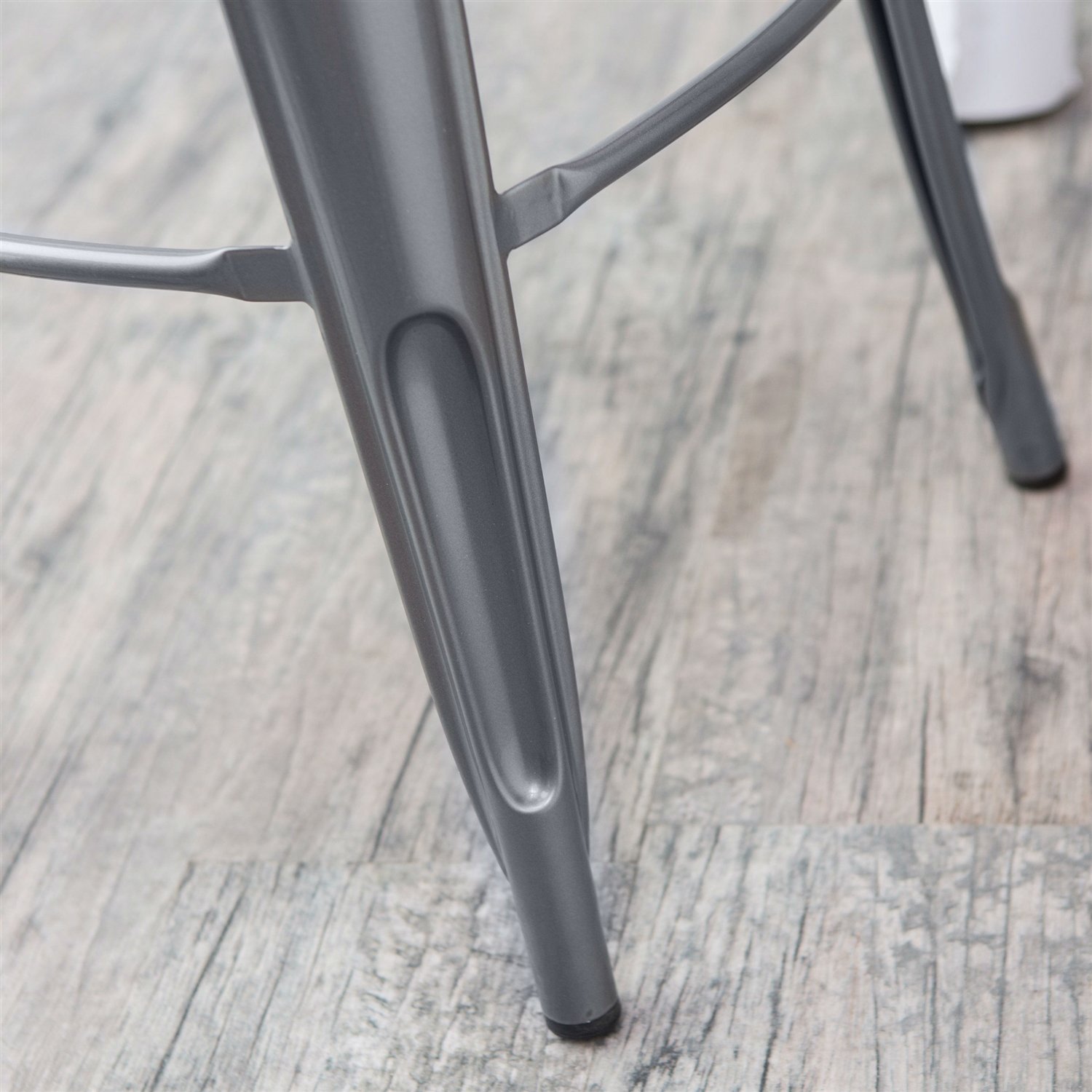 This Set of 2 Steel Metal 24-inch Counter Height Bar Stools in Powder Coat Silver Finish give any space a rustic warehouse vibe. These attractive stools are made from welded pressed steel and are given a durable powder-coat finish for a lasting, functional beauty. Rubber feet offer comfort as well as floor protection. Strong yet lightweight, each stool has leg braces and a cut-out handle in the seat for easy positioning. Choose from two sizes to match your setting.