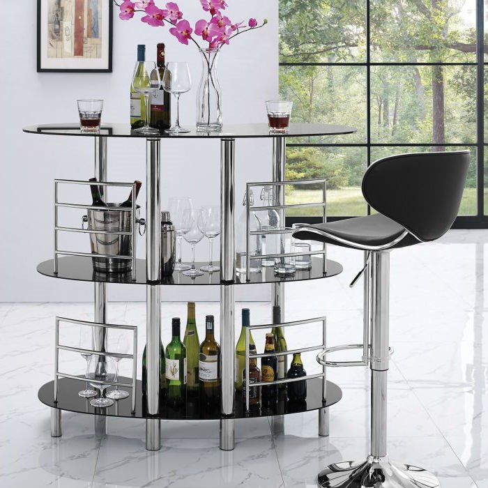 The Sturdy Modern Home Bar with Glass Top offers an ultramodern space to serve and sip cocktails. Crafted from chromed metal and glass, this bar is both sleek and sturdy. Its three glass shelves and chrome-finished rails allow you to display your best barware and finest drink selections in style.
