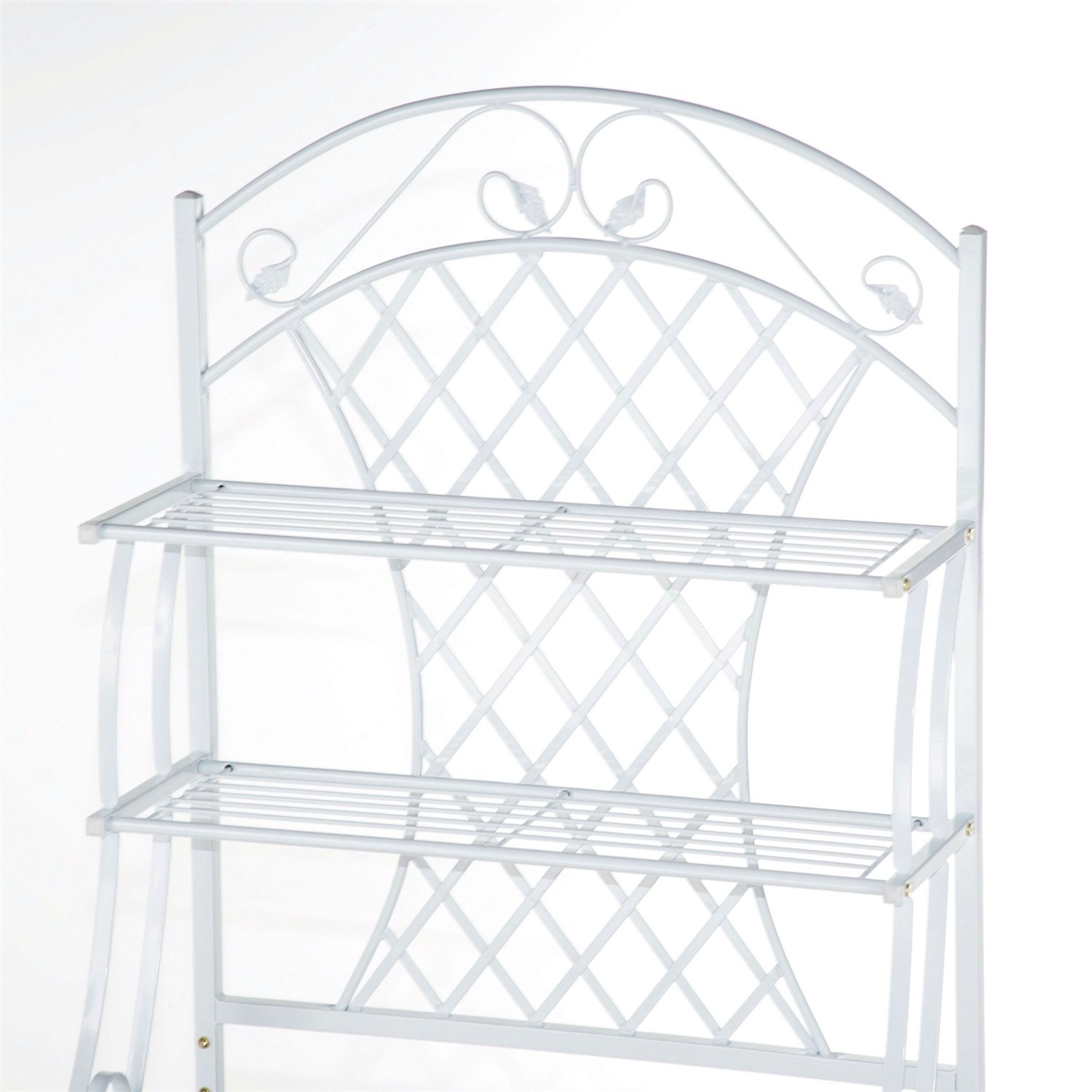 Enhance a sunny wall in your kitchen or dining area with this White Metal Bakers Rack with 5-Bottle Wine Rack and Wooden Work Shelf. The Bakers Rack, has the frame of this rack rounded at the top and has scrolls above and on the sides. It has lattice work on the back to enable a plant to trellis upwards. Four open wire shelves and a wooden work shelf give you lots of storage and display options. Keep up to five of your favorite bottles of wine close at hand on the wine rack too. Bowed front legs add a graceful element to the look of this rack, and its white color works in any decor.